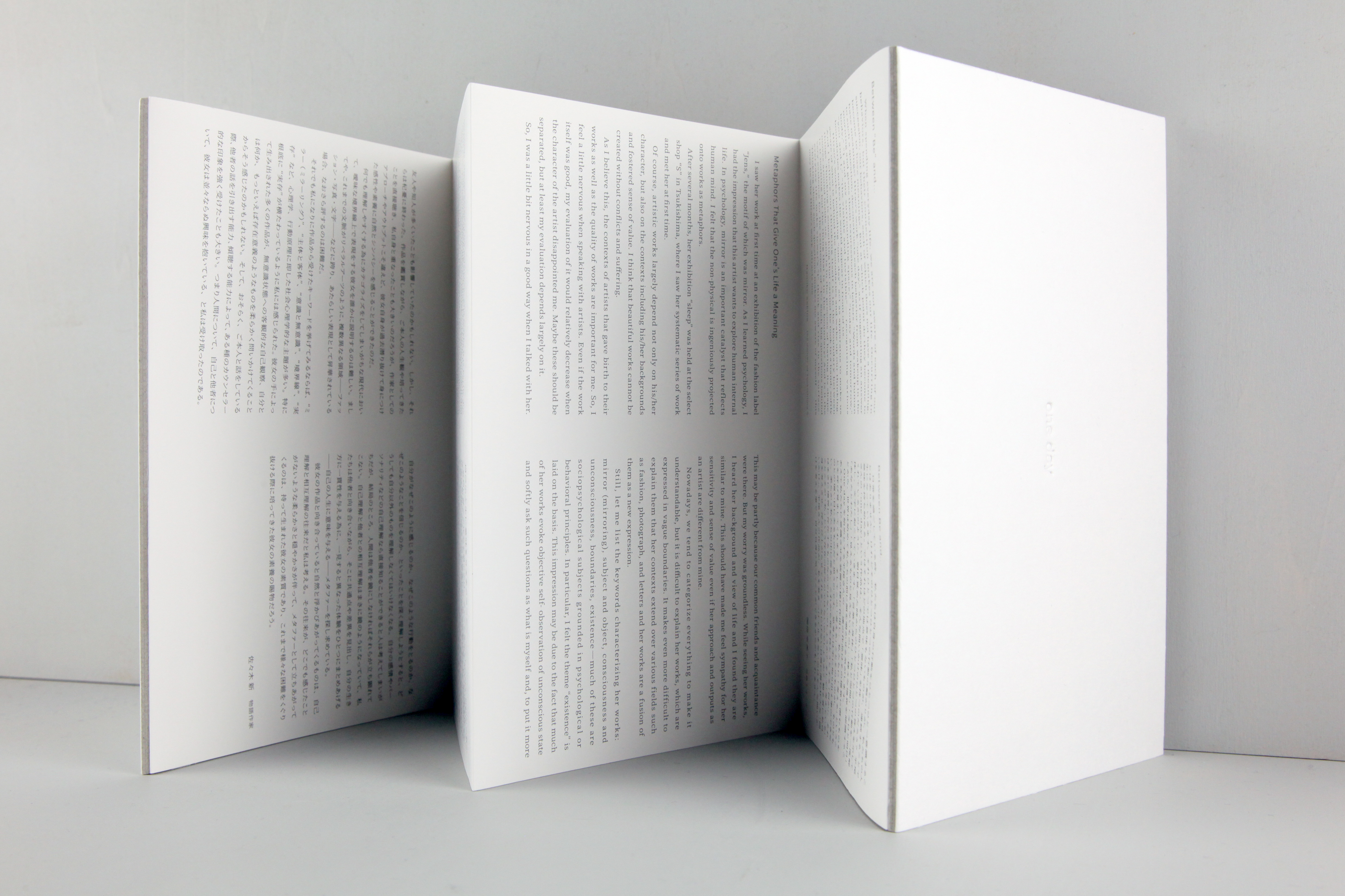 とある日常の「一日」という単位の時間軸にある行動の繋がりを解体し、言葉に起こしていく作品「one day」を本にまとめました。これまでの「one day」の記録と、月島Sのオーナー関根奈美子氏と、物語作家の佐々木新氏によるレビューをまとめた別冊付きの二冊組です。