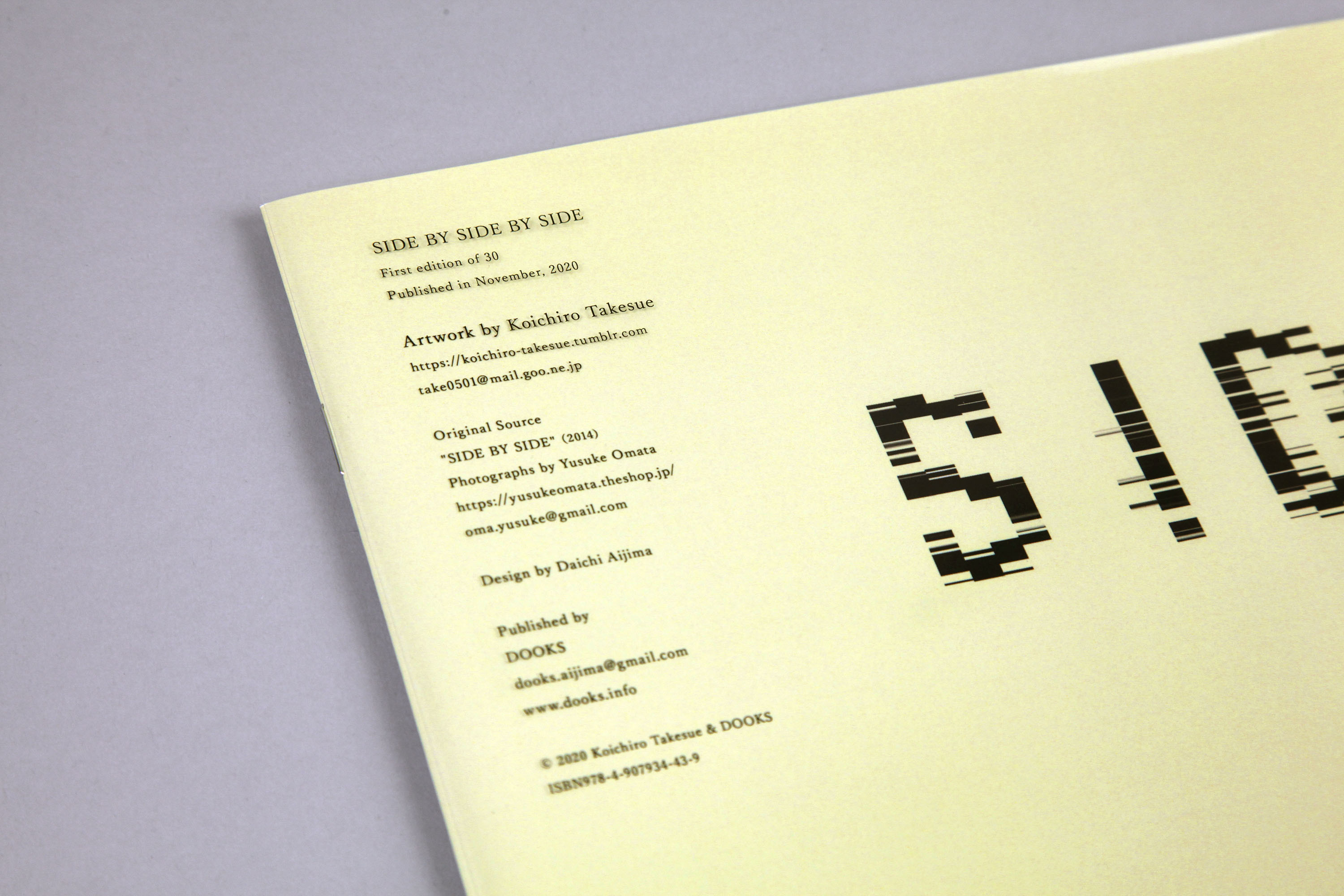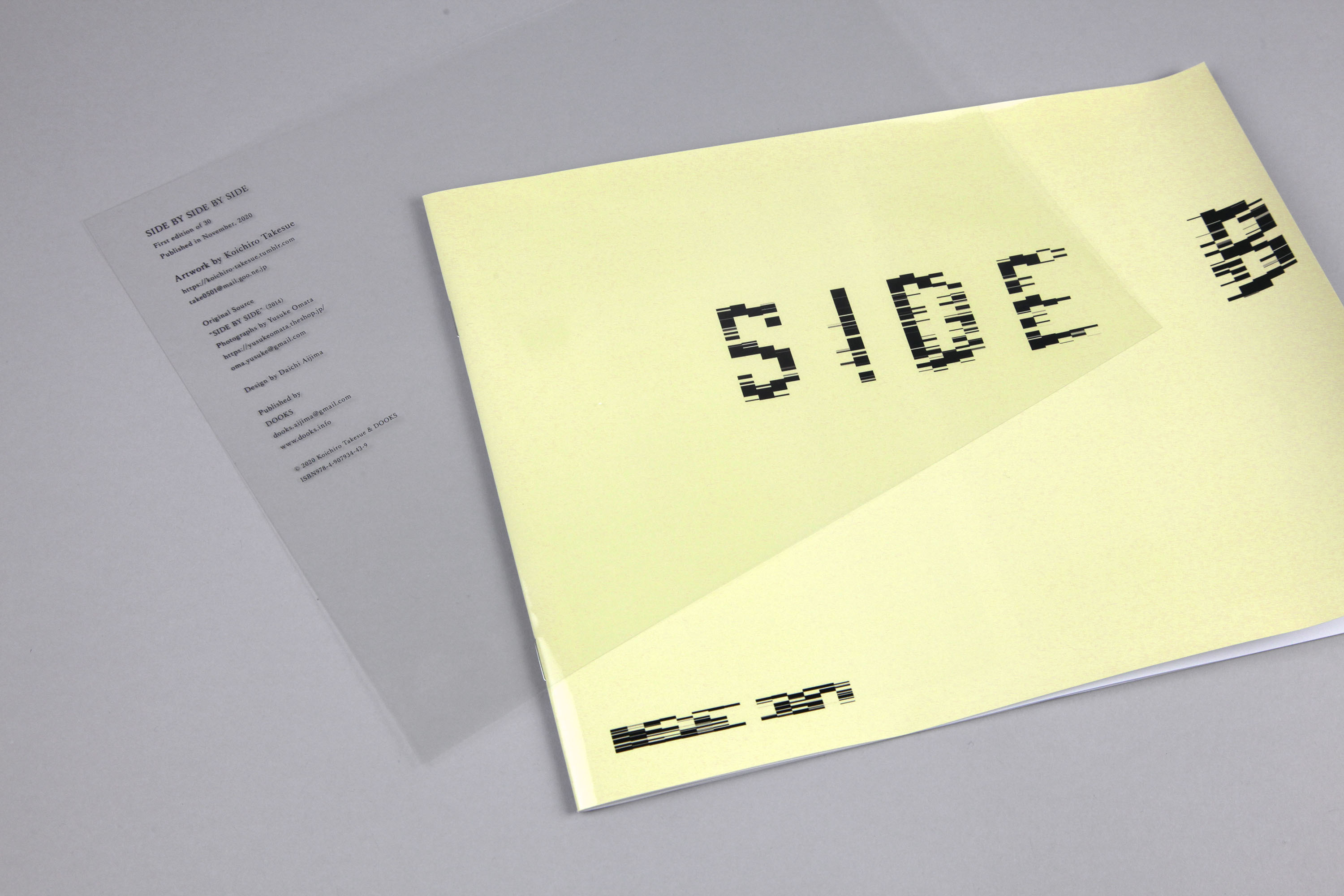 2014年DOOKSより出版された小俣裕祐の写真集「SIDE BY SIDE」を武居功一郎が「lines」という作品を基に、デジタル処理によってまるごと描き換えることで、本の機能・物質性を消滅させ、本ではない別のオブジェクトへと変換する試み。