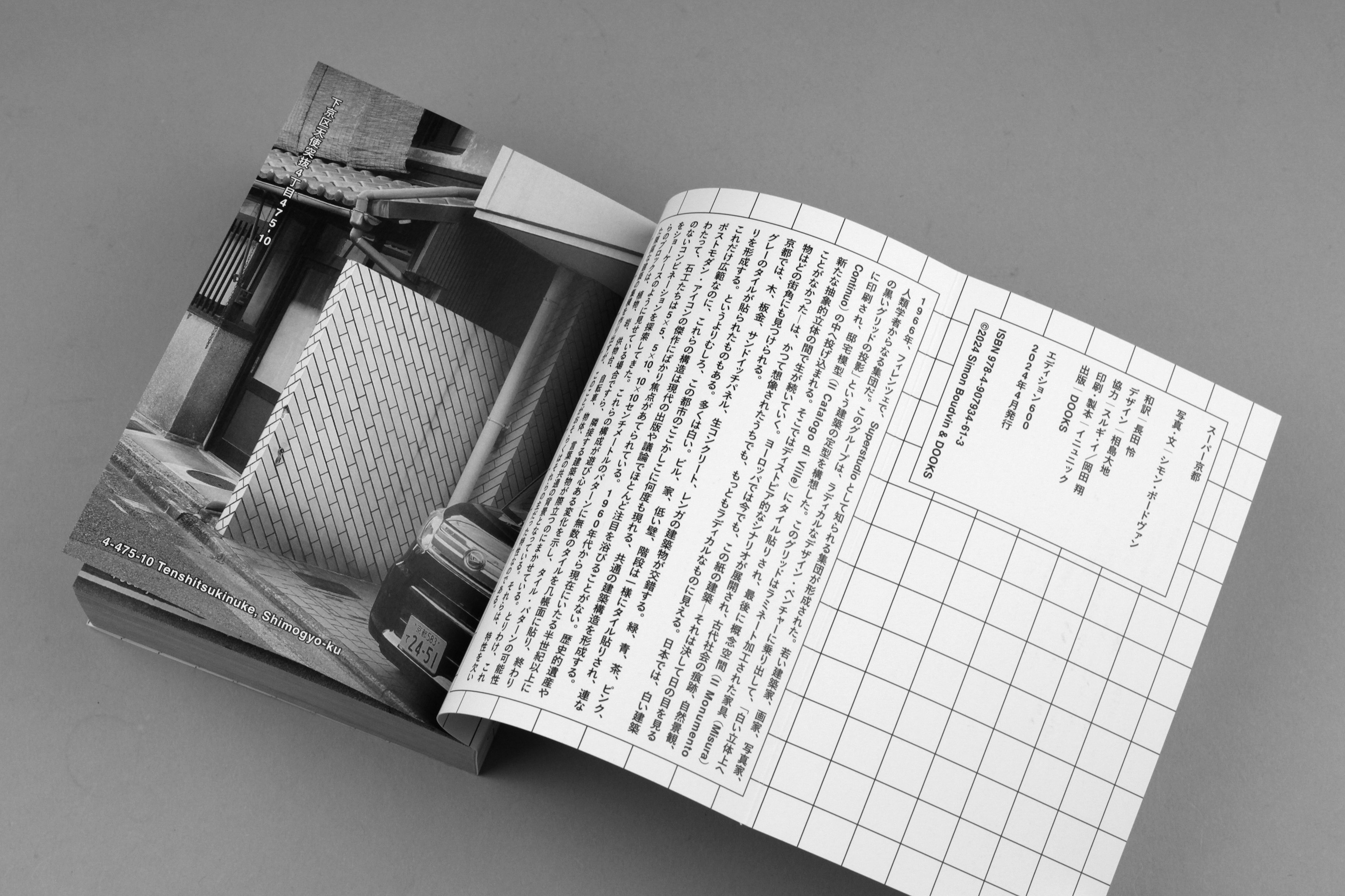 「スーパー京都」というタイトルは、グリッドパターンで知られるイタリアの建築家集団「スーパースタジオ」から引用したものです。フランスのアーティスト、シモン・ボードヴァンは京都に滞在し、街中にあるタイル壁の建築物を数多く撮影しました。かつてスーパースタジオが思い描いた反ユートピアの光景は、全く異なる土地・京都に時間をかけて広がっていました。グリッドは日常生活の中で多くの物や形の背景となっています。