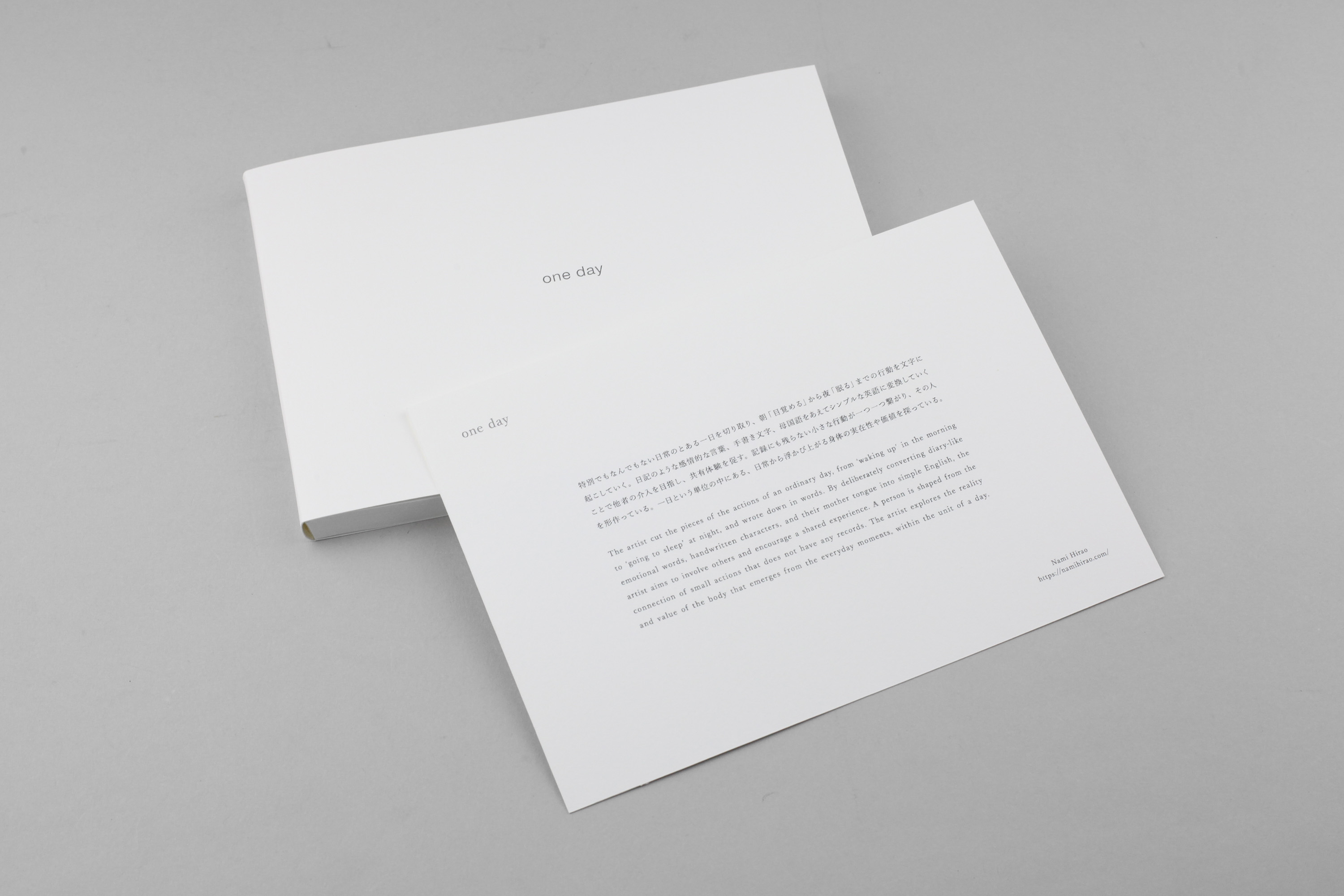 とある日常の「一日」という単位の時間軸にある行動の繋がりを解体し、言葉に起こしていく作品「one day」を本にまとめました。二作目からは他者にインタビューした記録を元に制作しています。コンセプトカード(コーヒー跡)付き。
